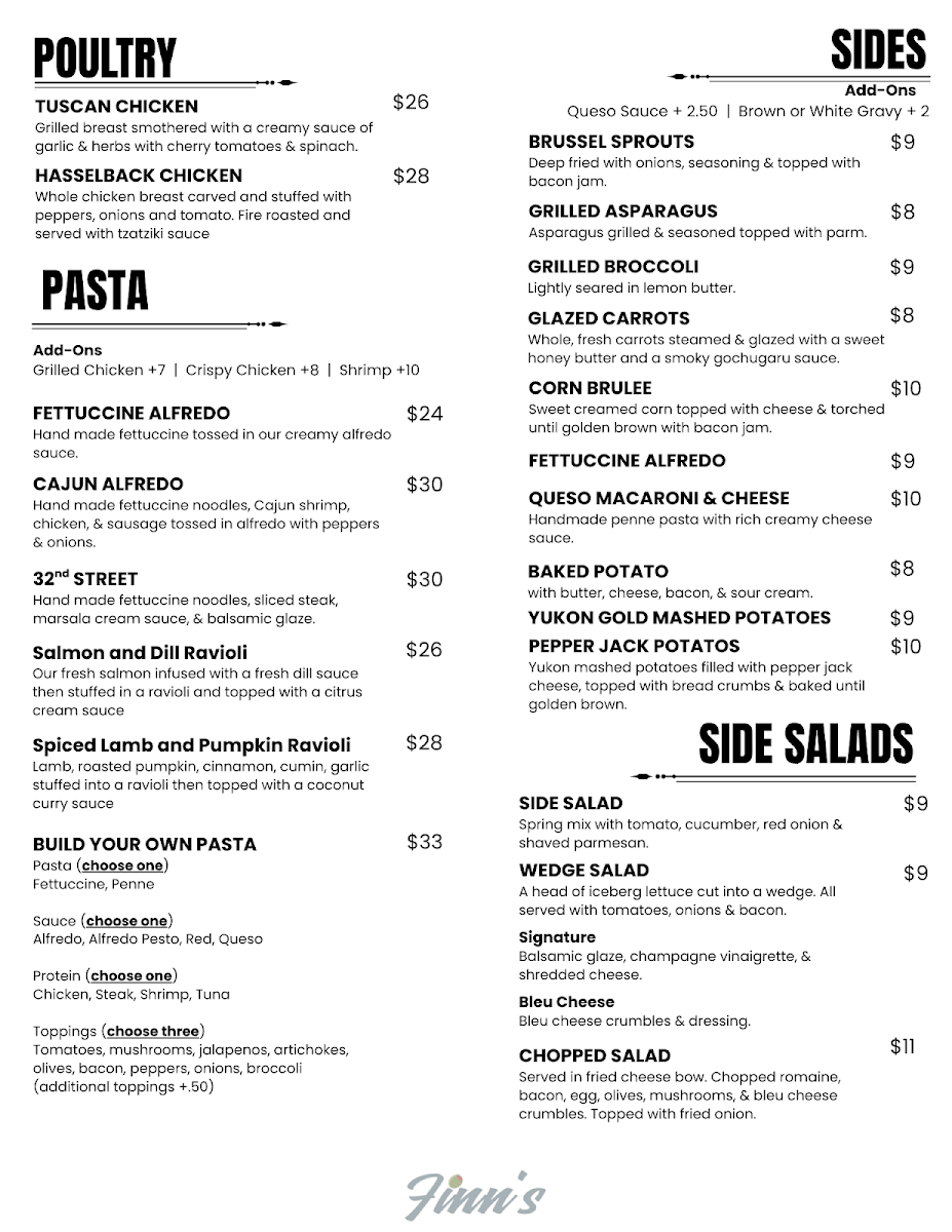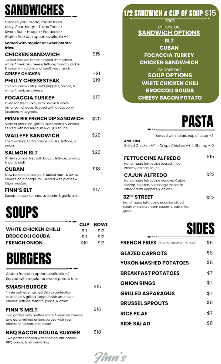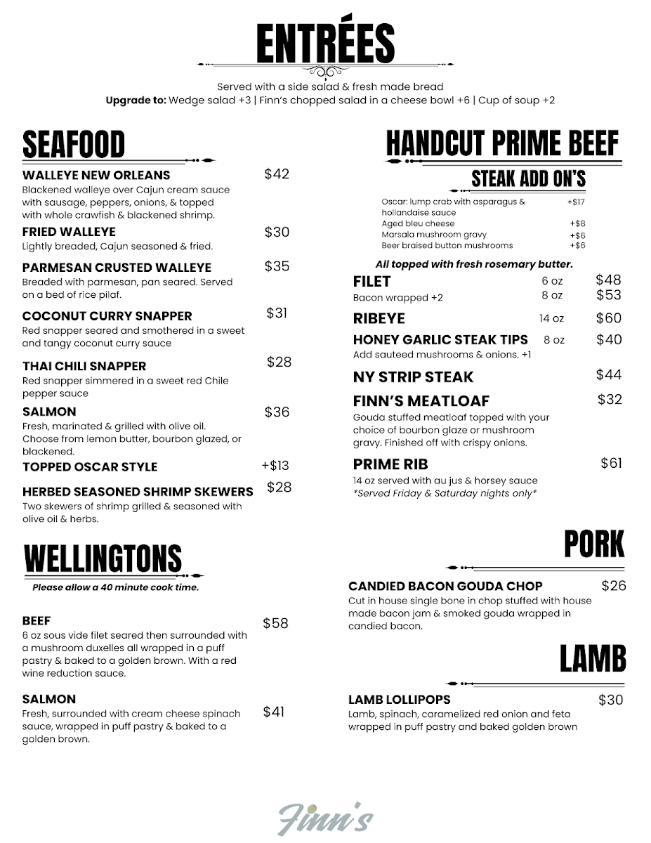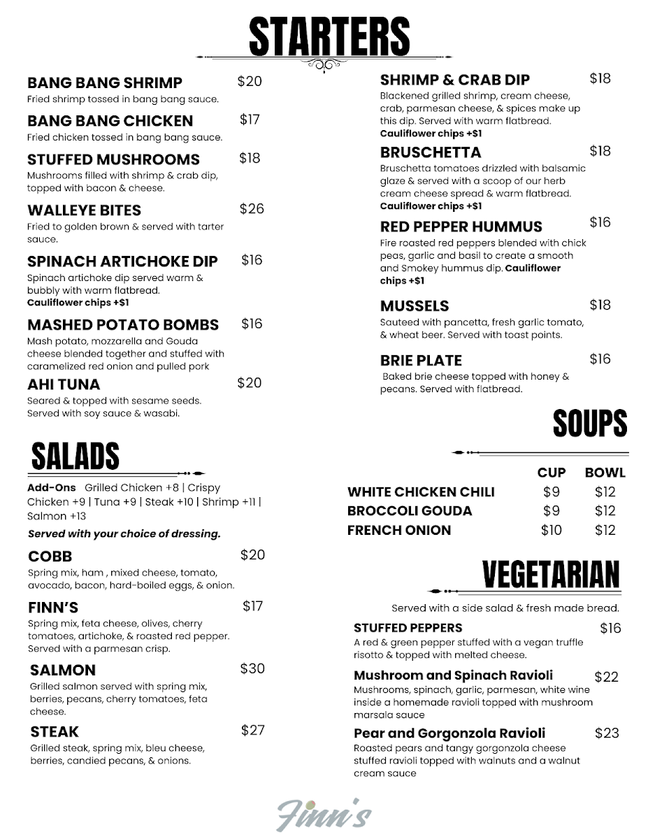 At Finn's, the menu is an invitation to indulge in deliciously crafted dishes that reflect the heart and soul of great food. Whether you're craving something light or hearty, each item is designed to delight the taste buds with fresh, quality ingredients. From savory starters to satisfying mains, every dish offers a balance of bold flavors and comforting textures, perfect for any occasion. If you’re in the mood for a flavorful meal in a welcoming atmosphere, Finn's Menu has something that will hit the spot. Their variety ensures there’s always something new to try, keeping every visit exciting. With an array of options, you’ll find yourself returning to explore more of what Finn’s has to offer.