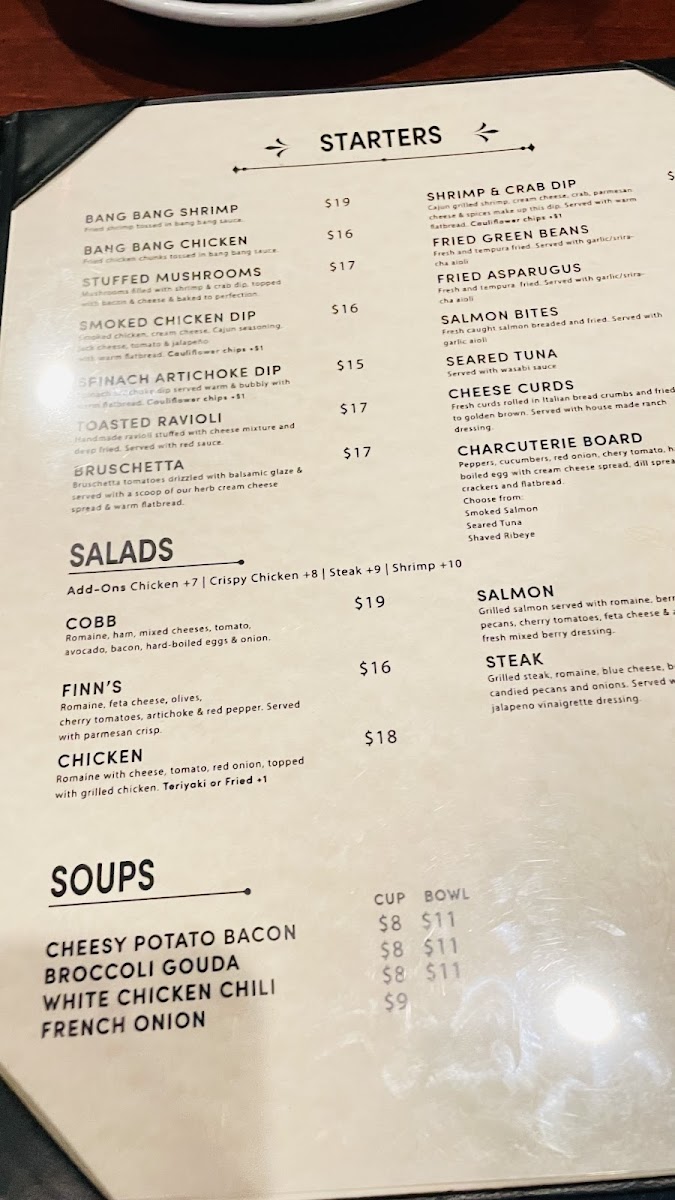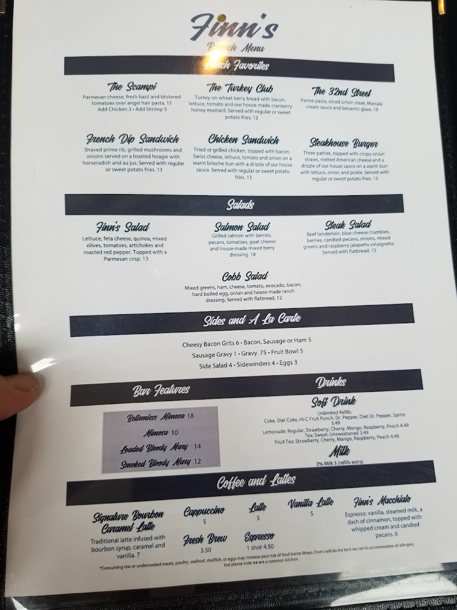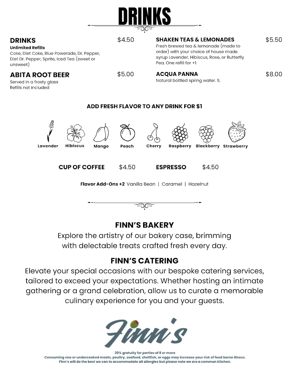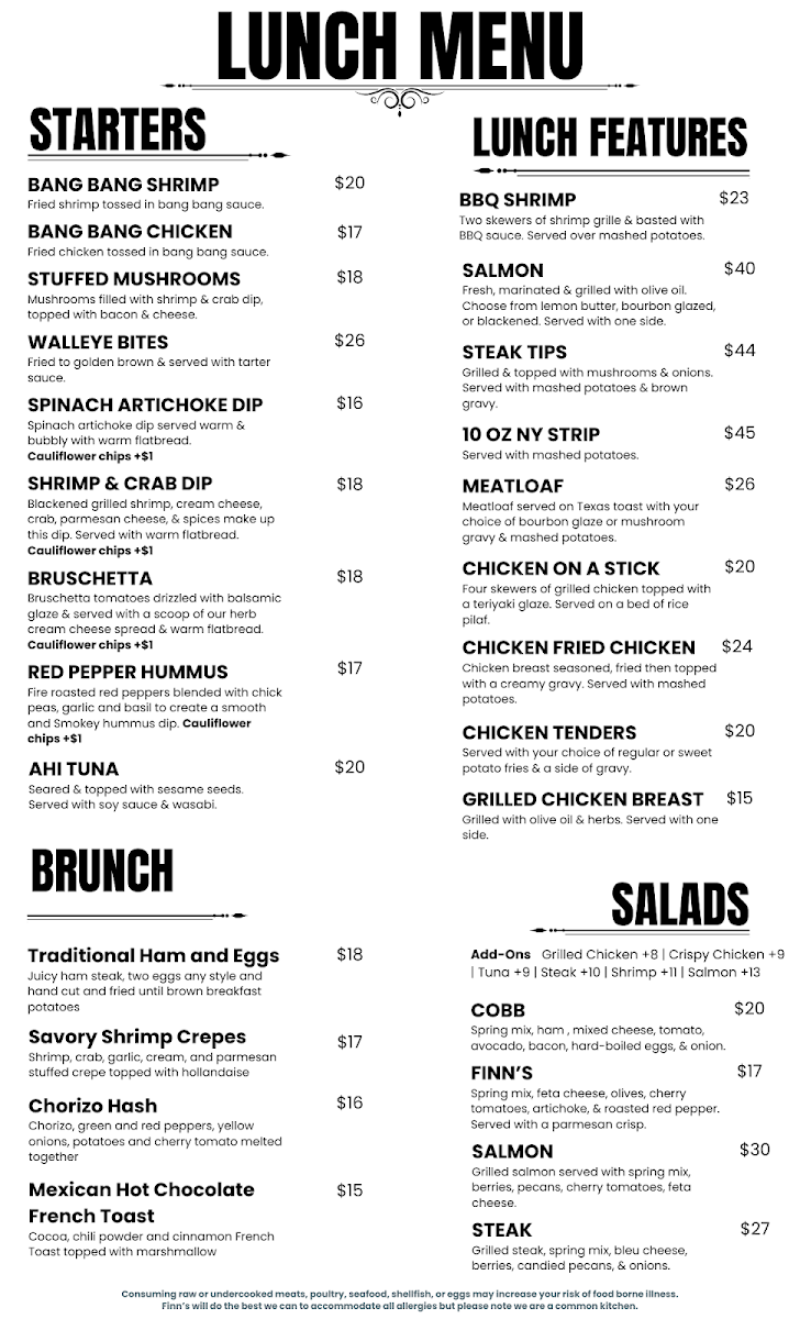 At Finn's, the menu is an invitation to indulge in deliciously crafted dishes that reflect the heart and soul of great food. Whether you're craving something light or hearty, each item is designed to delight the taste buds with fresh, quality ingredients. From savory starters to satisfying mains, every dish offers a balance of bold flavors and comforting textures, perfect for any occasion. If you’re in the mood for a flavorful meal in a welcoming atmosphere, Finn's Menu has something that will hit the spot. Their variety ensures there’s always something new to try, keeping every visit exciting. With an array of options, you’ll find yourself returning to explore more of what Finn’s has to offer.